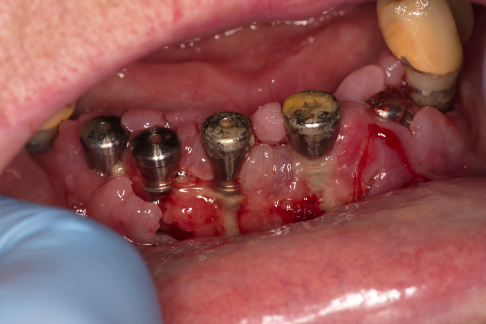 Зъбни импланти с натрупвания на плака и зъбен камък - налице е изразено остро възпаление. В рамките на три дни се формира структурирана зъбна плака, която е особено агресивна - в нея се развиват аеробни и анаеробни микроорганизми, които са основният причнител на зъбния кариес и пародонтита. При периимплантита (възпаление на тъканите около зъбния имплант) положението е същото - наличието на зъбна плака е основен етиологичен фактор. Това налага старателно почистване на надлигавичните елементи както от страна на пациента, така и професионално - от страна на зъболекаря. Колкото е по-грапава една повърхност, толкова повече плака задържа тя и толкова по-трудно става нейното почистване - поради което наистина зъбните импланти с полирана повърхност развиват периимплантити статистически доста по-рядко. Проблемът е че възпалението на околоимплантатнтие тъкани е полиетиологичен процес - предизвиква се от много и различни фактори, а и зъбна плака е възможно да се задържи дори и върху идеално полирана повърхност. На горната снимка например се виждат обилни натрупвания върху цикатризиращите винтове (сулкусформери) - те са полирани, и то при производствени, а не при клинични или лабораторни условия. Зъбната плака и зъбният камък обаче са налице.