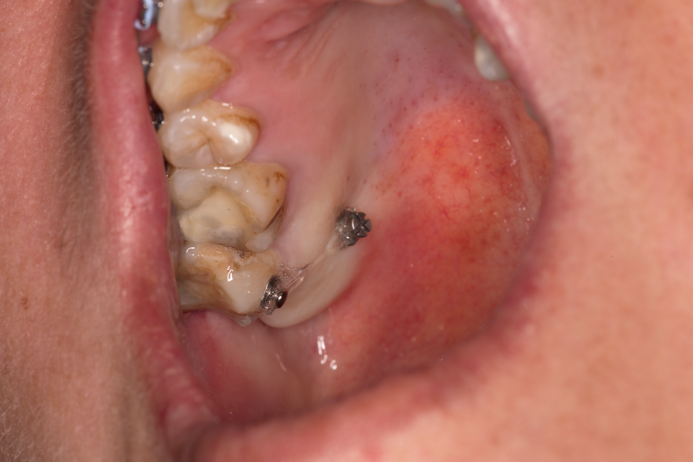 При горния клиничен случай се вижда и едно особено неприятно постоперативно усложнение - дехисценцията на оперативната рана. Статистически тя се наблюдава много по-често при поставянето на цикатризиращи винтове върху поставените импланти в сравнение с поставянето само на покривни винтове. Тази тенденция се обяснява с формирането на голям брой фиброзни мостчета между срещулежащите ламба - синтезираните съединителнотъканни влакна са механична пречка за отварянето на оперативната рана, което именно представлява дехисценцията. Наличието на гингивални оформители (сулкусформери) пречи на фиксацията на двете раневи повърхности една към друга и вероятността от дехисценция нараства значително. Колкото по-голям е размерът на ламбата и особео дълбочината на отпрепариране, толкова по-вероятно е да се отвори и оперативната рана. Обикновено това се случва на осми - десети ден след поставянето на шевовете - когато започне синтез на съединителна тъкан в дълбочина и съответно придърпване на лигавицата и периоста.