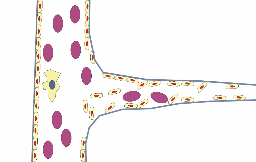Първоначална ситуация - нормален кръвоносен съд, изпълнен с кръвна плазма и формени елементи. Виждат се няколко еритроцита и единичен левкоцит. В съседните тъкани липсва увреждане, ситуацията изглежда нормална - доколкото нещо в човешкия организъм изобщо може да бъде нормално. Базалната мембрана на кръвосносния съд е запазена, покрита е с един слой ендотелни клетки. При нормлани условия ендотелът представлява еднослоен плосък епител, изключително рядко - еднослоен кубичен епител. Това всъщност е единственият еднослоен плосък епител в организма - няма необходимост от по-сериозна механична бариера, а единствено от тъкан с изолираща функция. Същевременно точно този епител, на пръв поглед елементарно устроен, играе огромна роля в цялата човешка патология. Немалка е ролята на ендотела и при физиологични условия - и тъй като физиологичните и патологичните процеси в човешкия организъм много често са изключително тясно преплетени и протичат в много тясна взаимовръзка, изучаването им в детайли е от огромна полза за всеки един теоритик или практикуващ лекар в която и да е област на медицината.