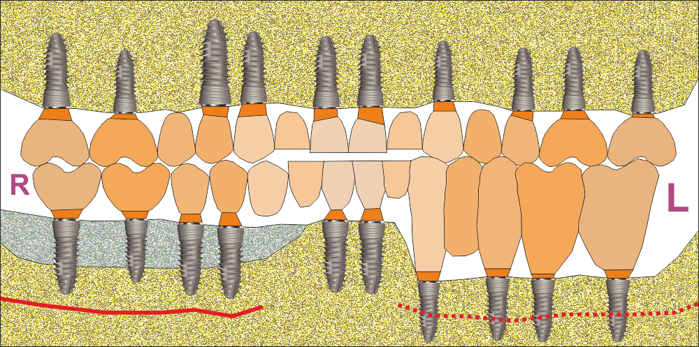 Схема на различните опции за поставяне на зъбни импланти при тотално обеззъбяване на долната челюст - при недостатъчен костен обем основно в страничния участък. Тъй като в медицината почти винаги съществуват няколко различни възможности за подход към лечението на едно заболяване, следва да се обсъдят предимствата и недостатъците в единия и другия случай и възможните усложнения в краткосрочен и дългосрочен аспект. Най-общо при недостатъчен костен обем има две възможности - увеличаване на височината на алвеоларния гребен (вертикална костна аугментация - участъкът вдясно, означен с R) или латерализация на съдово - нервния сноп на мандибулата - участъкът вляво, означен с буквата L. Очевидно е че при втория случай зъбните импланти се поставят на по-голяма дълбочина и следва да се изработят корони и мостове със значително по-голям размер. Обратно, при вертикална аугментация на алвеоларния гребен имплантите се поставят на по-малка дълбочина и короните и мостовите тела са с нормална анатомия - случаят вдясно. Към настоящия момент различните автори застъпват различни схващания по въпроса как да се подходи към такъв клиничен случай, но повечето изследователи се изказват в полза на лечебния подход вляво - увеличаване на вертикалния размер на алвеоларния гребен. Това не винаги е технически лесно за изпълнение, но и латерализацията на съдово - нервния сноп също е трудна за изпълнение оперативна интервенция и изисква значителен клиниен опит и сръчност от страна на хирурга; не на последно място и значителна мотивация и търпение от страна на пациента. Дългосрочните резултати обаче са значително по-добри при подхода вдясно, отколкото при подхода вляво (вляво съдово - нервният сноп на мандибулата е означен с пунктирана линия). Зоните на потенциални проблеми и усложнения са показани на схемата долу.