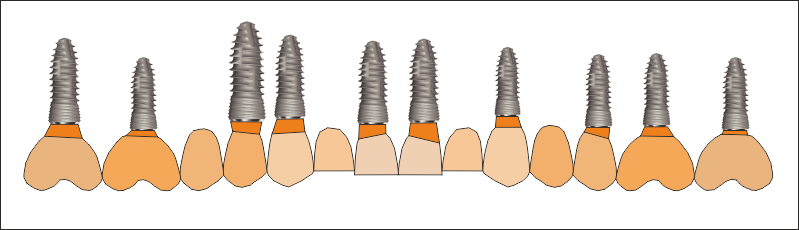 Схема на голяма неснемаема протезна конструкция, изработена само върху четири зъбни импланта - напоследък често се рекламира като All-on-four. При достатъчно голяма дължина и особено ширина на зъбните импланти подобна конструкция никога няма да създаде проблем по отношение на костно - имплантатния интерфейс. Проблемите ще възникнат другаде - в областта на връзката между имплантите и абатмънтите. Проблемните области са означени с червени звездички на горната схема. Механичното претоварване, което е резултат от концентрацията на всички дъвкателни сили само в четири точки, води до разхлабване или фрактуриране на свързващите винтове, до счупване на имплантатни надстройки или дори до най-неприятното усложение - фрактура на зъбен имплант. Всъщност горната схема е донякъде неточна - при системите All-on-four зъбните импланти се поставят основно в областта на горните и долните фронтални зъби, тъй като тези системи са разработени основно за дентални лекари, които се страхуват от повдигането на пода на максиларния синус. Това налага изработката на много дълги висящи тела - с два, а понякога дори и с три зъба, което предизвиква още по-големи механични претоварвания в областта на имплантатната шийка. Поради това в много случаи зъбните импланти се шинират с дебела метална траверса, която е фрезована и върху която с помощта на фрикционни взаимодействия се задържа самата мостова протезна конструкция. Това силно подобрява механичната устойчивост на цялата система, но някои недостатъци остават - има голям брой мостови тела, под които се задържа храна.