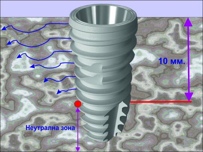 Схема на силовите разпределения по протежението на един зъбен имплант. Както всички твърди тела, имплантатната платформа има определен модул на еластичност и при приложение на силови въздействия във всяка една посока търпи еластични деформации. Модулът на еластичност се определя от материала, от който е изработено твърдото тяло - в случая чист титан. След протичане на процесите на остеоинтеграция вътрекостната част на импланта е здраво фиксирана в костта - налице е противодействие по отношение на механичните сили както от страна на зъбния имплант, така и от страна на периимплантатните костни тъкани. Това води до усложняване на целия модул и до затруднени изчисления относно това какво точно се случва при различни силови въздействия. За щастие съвременните компютърни програми за триизмерна симулация позволяват проучването във виртуална среда и на доста по-сложни системи като самолети, космически кораби или цял жив човешки или животински организъм. При проучвания във вирутална среда, а впоследствие и върху животни и хора е установено че при приложение на механични сили върху зъбния имплант и костта около него се формира един равновесен център - той е разположен на около 10 милиметра в дълбочина под нивото на костта. Под този център силите не предизвикват никакви деформации - нито на имплантатната платформа, нито на костта около нея. Разположението на равновесния център се определя освен от дължината на зъбния имплант и от неговата ширина, както и от големината на силата. Приема се също така че имплантът има цилиндрично - конусовидна форма, което е най-често срещаната при всички имплантатни системи в света в днешно време. Имплантатната ширина се приема за 4 милиметра (също много често срещана), като с увеличаване на ширината равновесният център се измества нагоре в посока към имплантатната шийка - т.е. по-широките импланти са още по-устойчиви на механични въздействия и освен това механично натоварват костта по-малко. Във виртуалната опитна постановка се задава сила на въздействие, която е равна на максималната сила на дъвкателната мускулатура - около 380 килограма или 3800 нютона. Това е важно от гледна точка на получените резултати, тъй като при различните сили центърът на противодействие ще се измества - при по-голяма сила ще се измества все по-навътре към костта, а при по-малка - отново в посока имплантатната шийка. Приета е стойност, равна на максималната дъвкателна сила, тъй като всички изследователи целят да проучат условия, максимално близки до условията на живия организъм. В действителност дори и при най-тежките парафункции един зъбен имплант няма да бъде подложен на максималната сила, която могат да развият мускулите, тъй като съществуват различни сухожилно - мускулни и пародонтално - мускулни рефлекси, които ограничават силовите въздействия. Поради това при научните изследвания в случая се оставя известен силов резерв - опитната постановка се подлага на екстремно натоварване, което е доста по-голямо от нормалното, но в същото време поне теоритично е възможно да се получи в човешкия организъм - при приложение на максималната възможна сила на дъвкателните мускули.