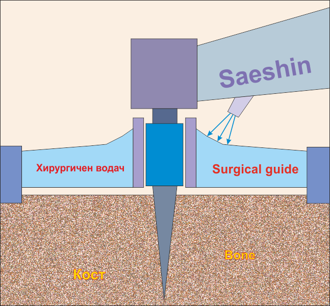 Правилна изработка и употреба на хирургичен водач. С цифрата 1 е означена металната втулка, която фиксира много точно положението и на пилотната фреза, и на калиброващите фрези. Тази втулка (или ръкав) се вгражда стабилно в пластмасата на водача; за да бъде ефективна обаче, трябва да се използват специално конструирани за целта фрези, каквито са включени в комплекта Navi Guide Surgical Kit на производителя Neobiotech например. Повечето производители на зъбни импланти предлагат също подобни фрези в своя набор от инструменти за имплантология. Разликата спрямо стандартните фрези е в наличието на метален фиксиращ цилиндър (на горната схема означен с яркосиньо). Този цилиндър се разполага в края на работната фреза, непосредствено преди захвата за имплантологичния наконечник и като диаметър съответства точно на вътрешния диаметър на втулката (sleeve). По този начин всички разпробиващи фрези са фиксирани в едно точно определено положение и отклоненията са минимални или нулеви.