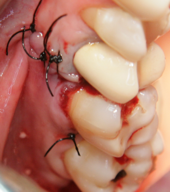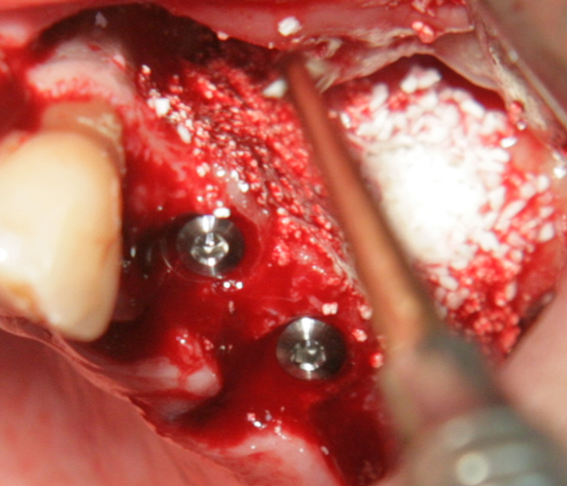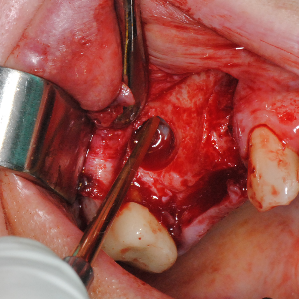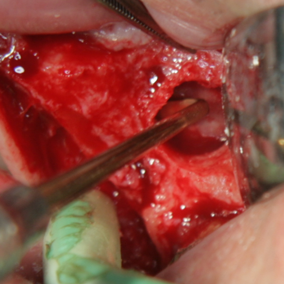Отворен максиларен синус в началото на интервенцията. Случаят е интересен със следното - твърде атипична форма на трепанационния отвор. На какво се дължи на това - на лошо планиране на оперативния достъп или на нещо друго? Дължи се на факта, че отначало въпросната намеса беше планирана като балонен синуслифт; за съжаление обаче мембраната на синуса се разкъса и надуването на балона стана невъзможно.